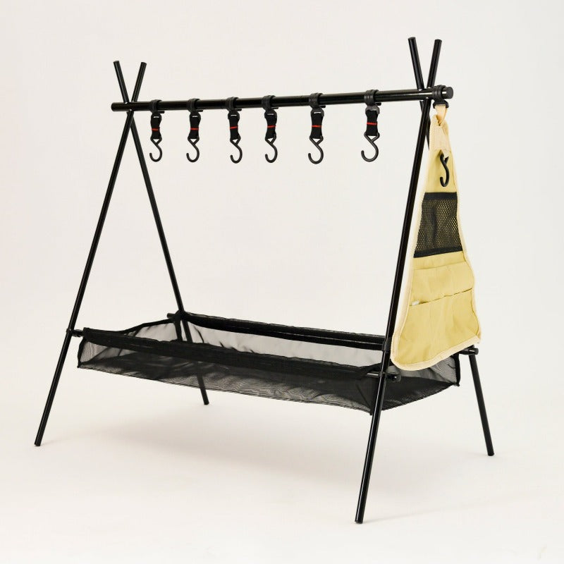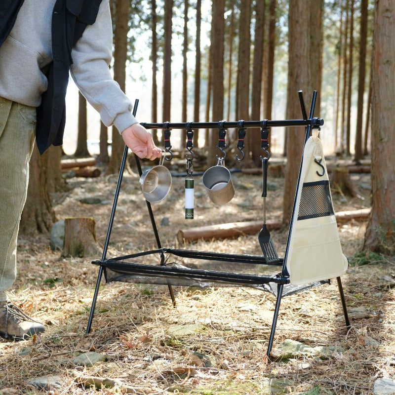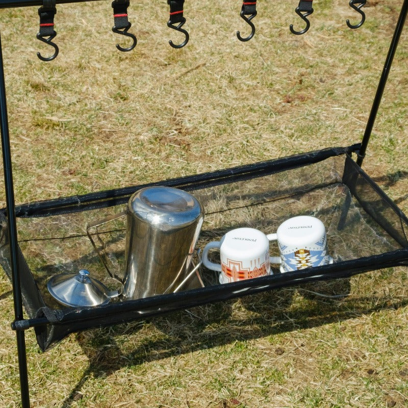 6つのフックだけでなく、三角ポケットとネットが付いているのがAforaハンギングラックの良いところ。ネットは洗った後の濡れた食器を乾かせます。三角ポケットはカトラリー収納にぴったり。