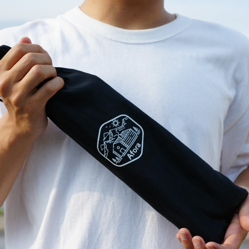 Aforaのロゴ入り収納袋に入れてお届けします。ペグやクランプといった部品がありますが、忘れた、なくしたなどと慌てることはもうありません。袋にいれることで、ポールがバラバラにならず持ち運びもラクラクです。